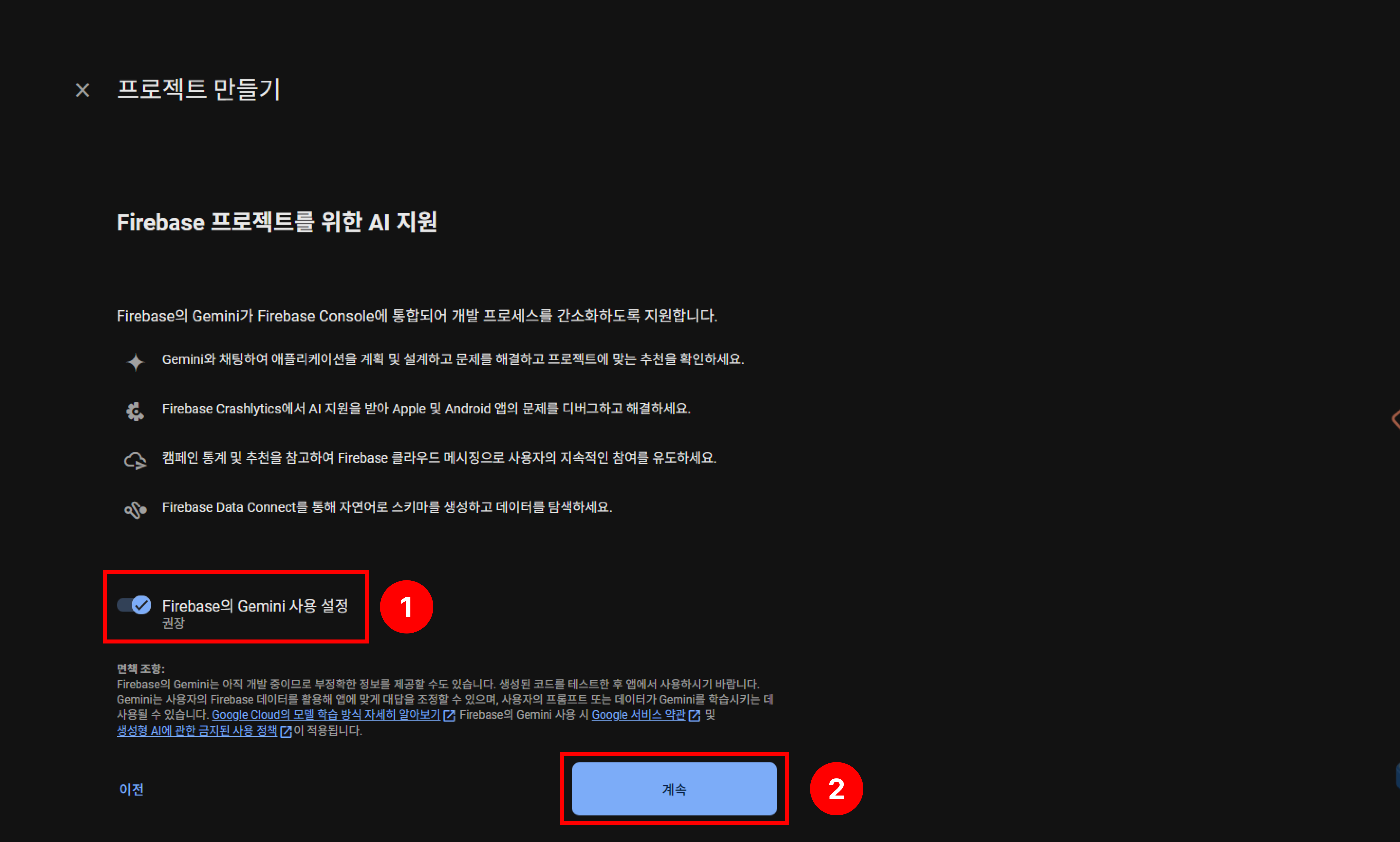 3단계) AI 지원 사용 설정 토글 ON 후 계속 버튼 클릭