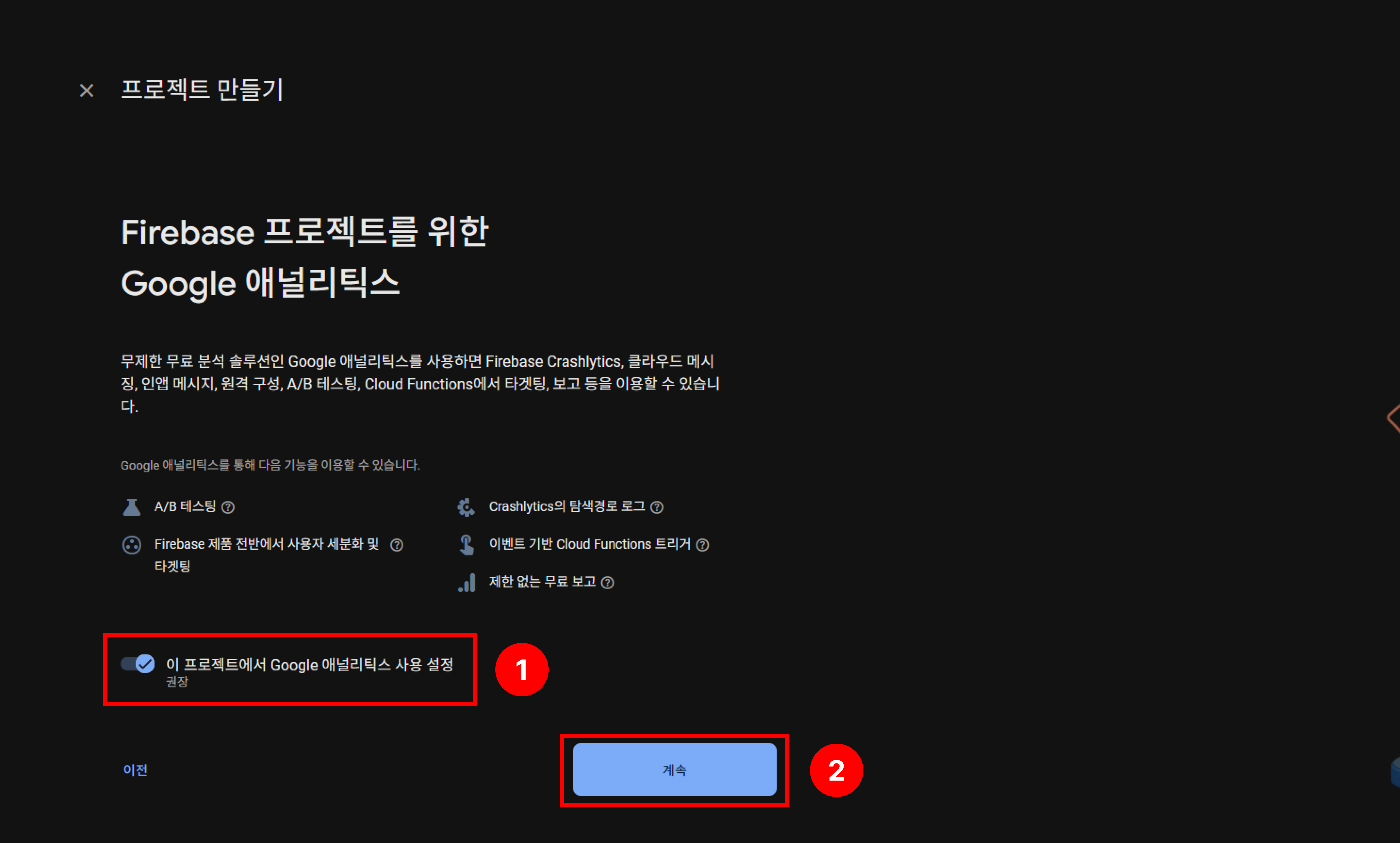 4단계) Google 애널리틱스 사용 설정 토글 ON 후 [계속] 버튼을 클릭