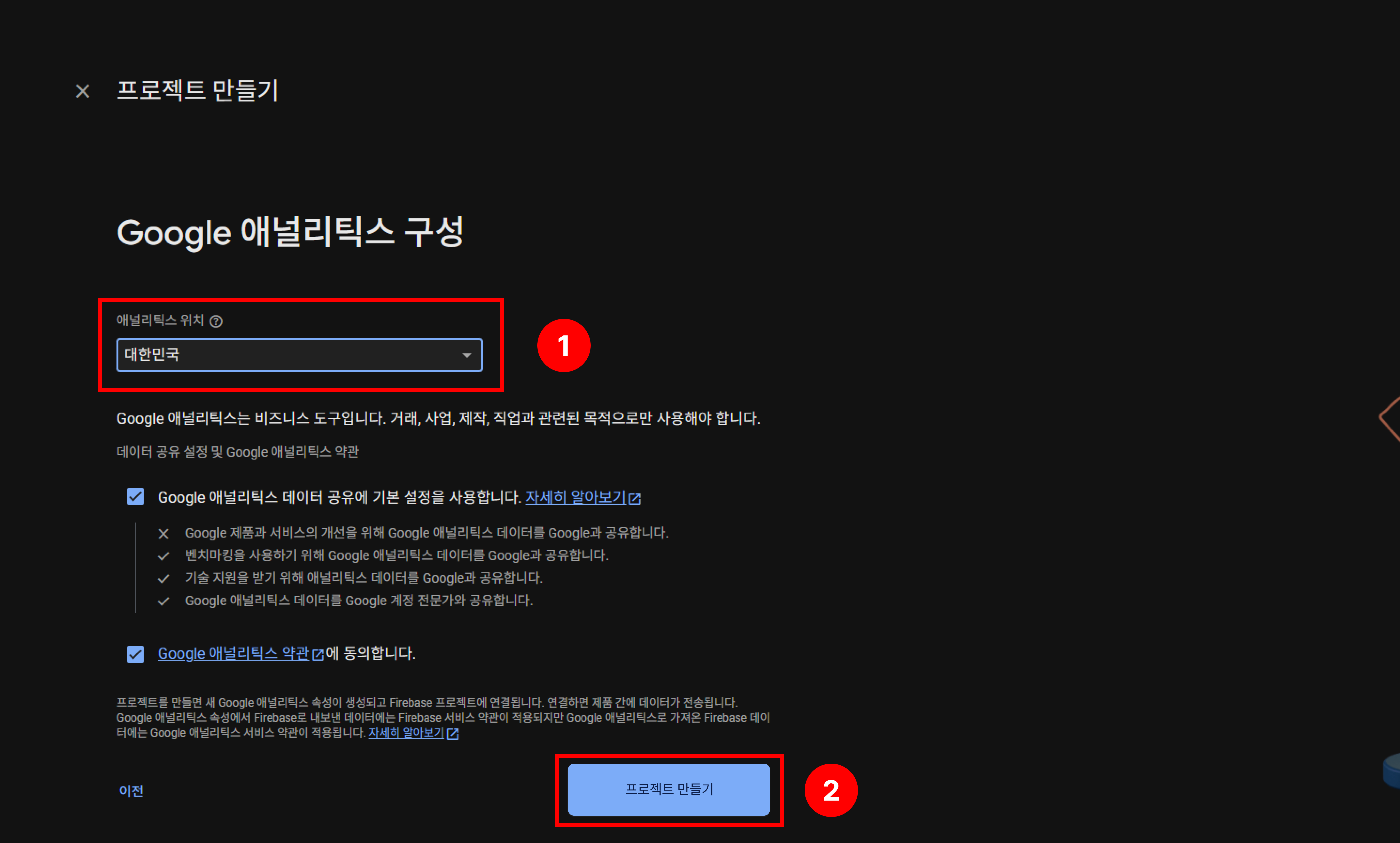 5단계) 애널리틱스 위치 [대한민국] 선택 후 [프로젝트 만들기] 버튼 클릭