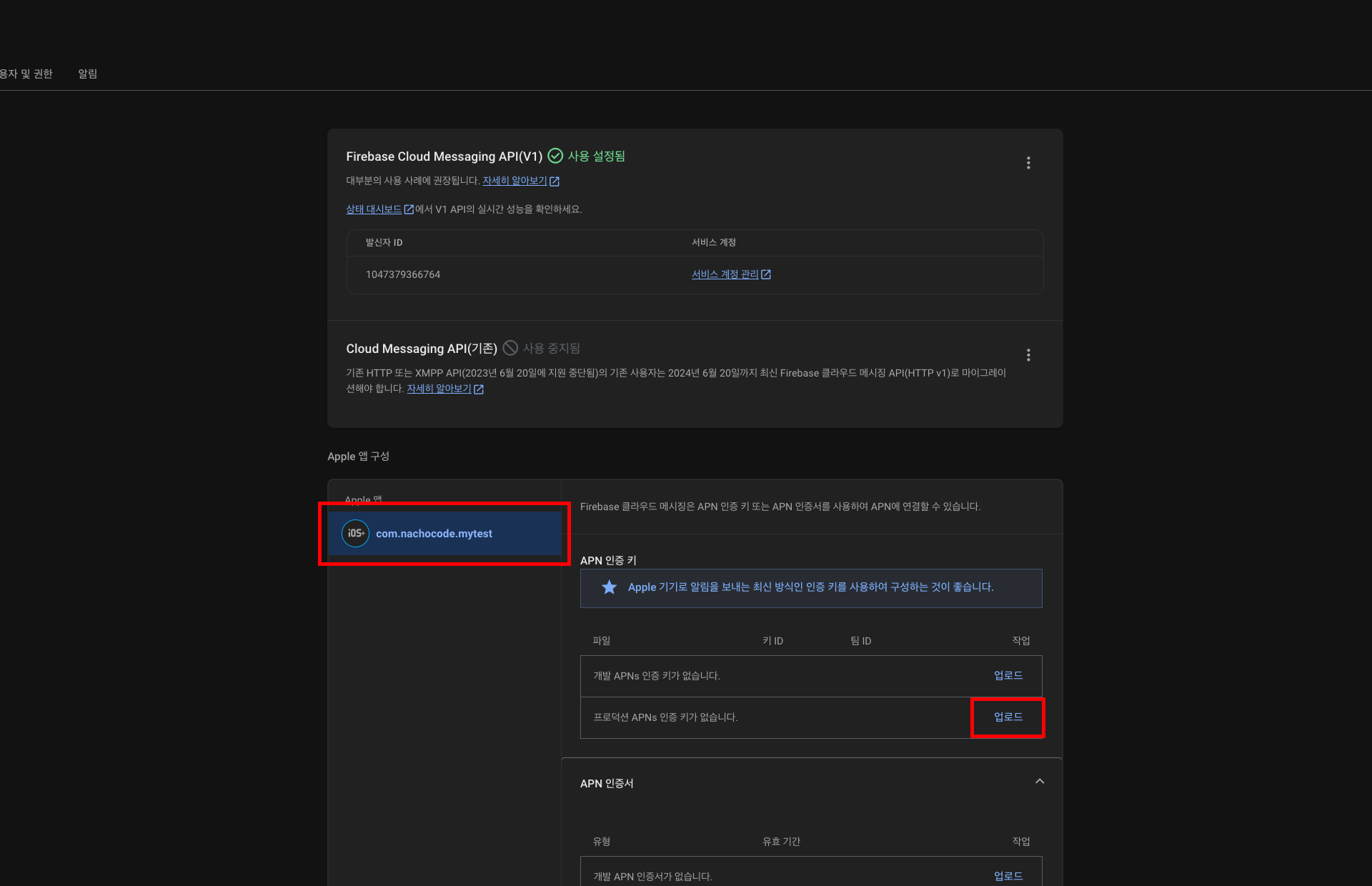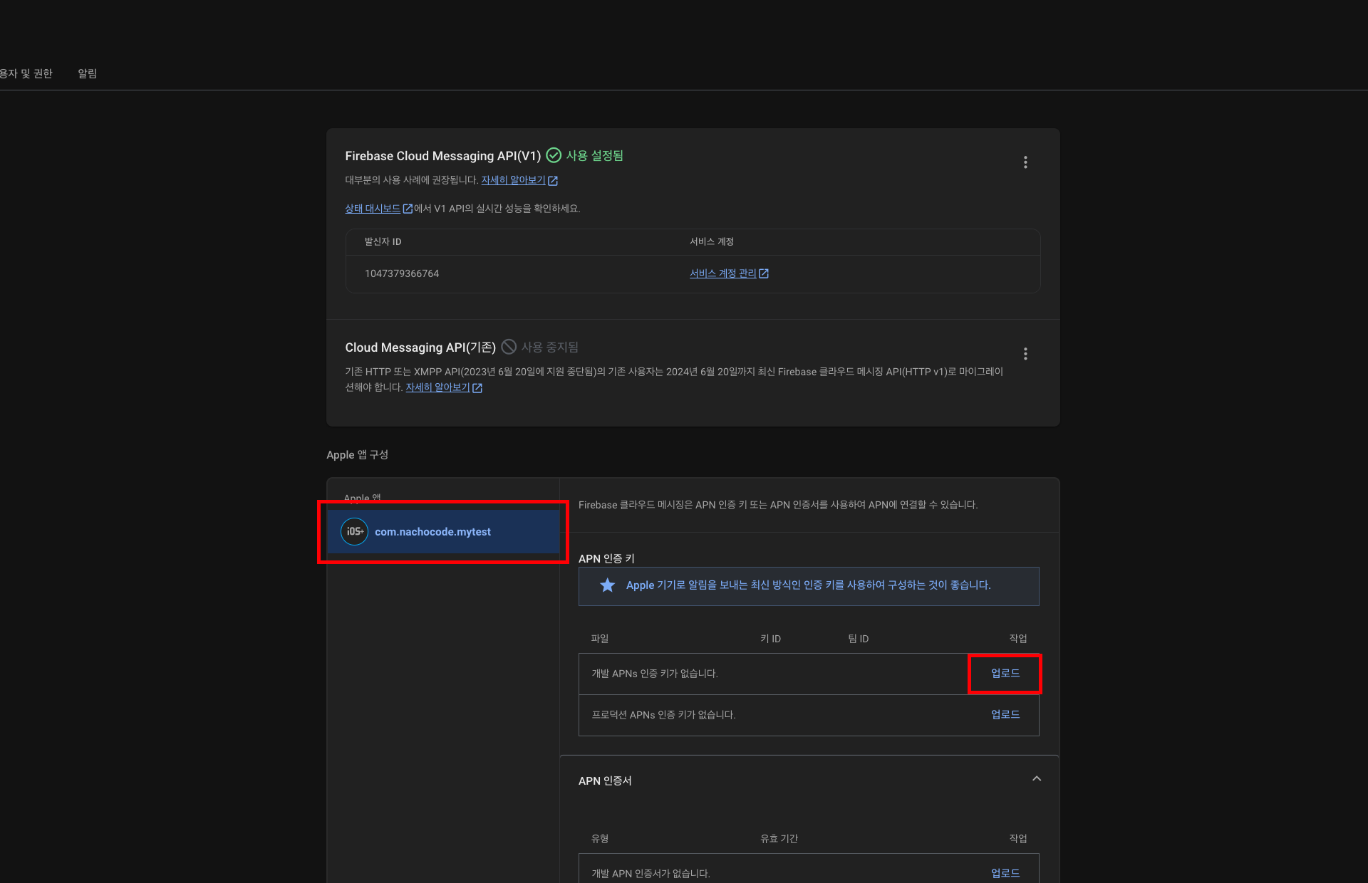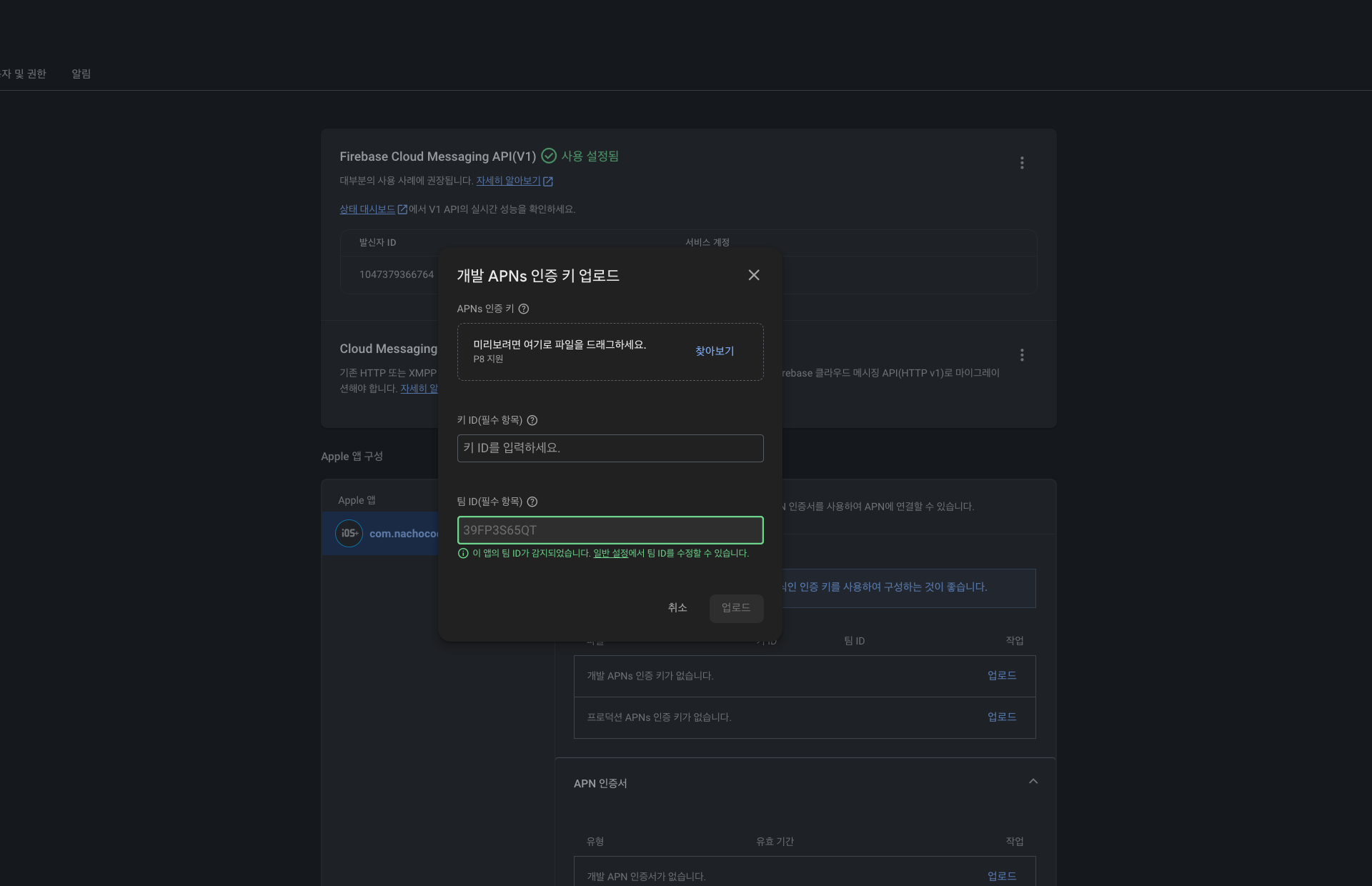 2단계) 생성한 iOS 프로젝트 탭 선택 → 개발 APNs 키 [업로드] 버튼 클릭 → APNs 인증 키 등록