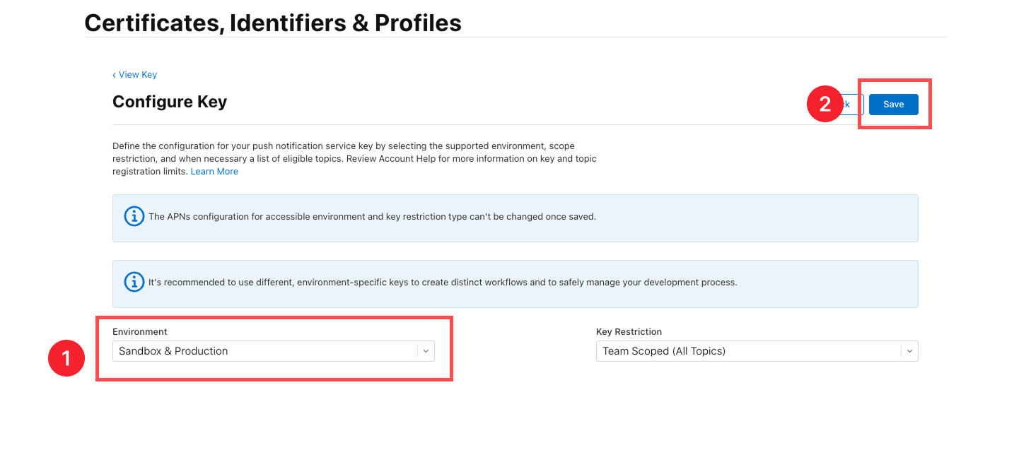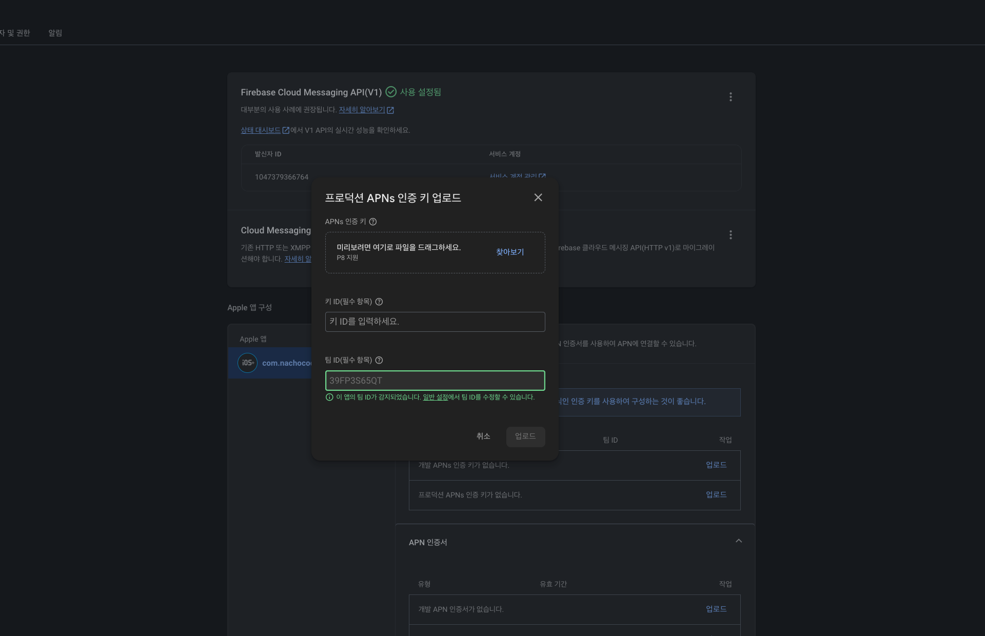 개발 APNs 인증 키와 프로덕션 APNs 인증 키는 동일하게 업로드해주세요.