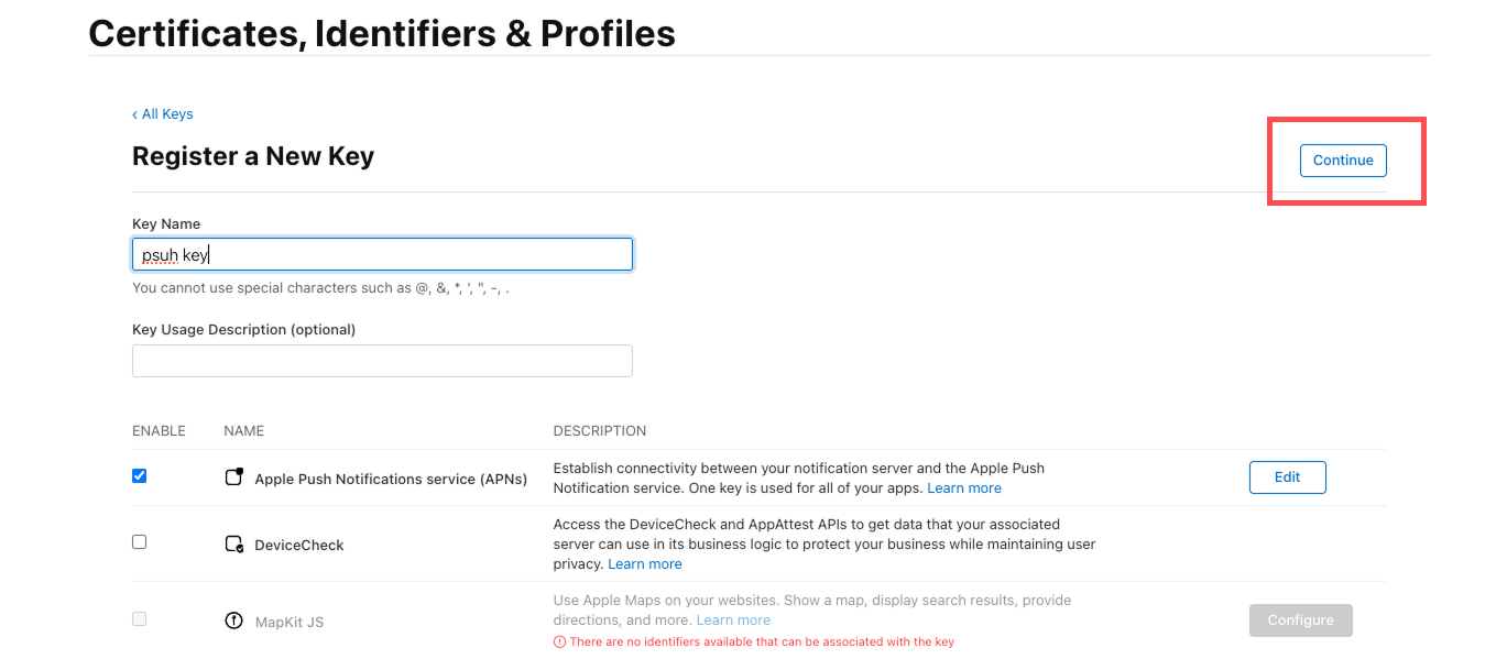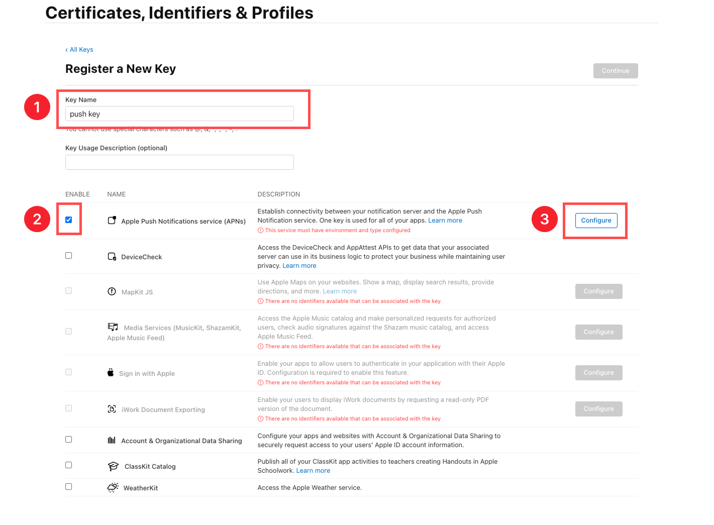 4단계) Key Name 입력 → 기능 선택 (Apple Push Notifications services (APNs) 클릭 → [Configure] 버튼 클릭